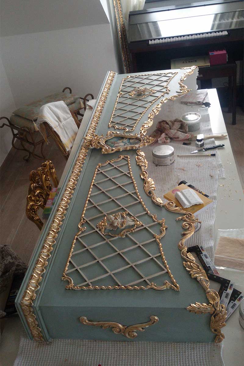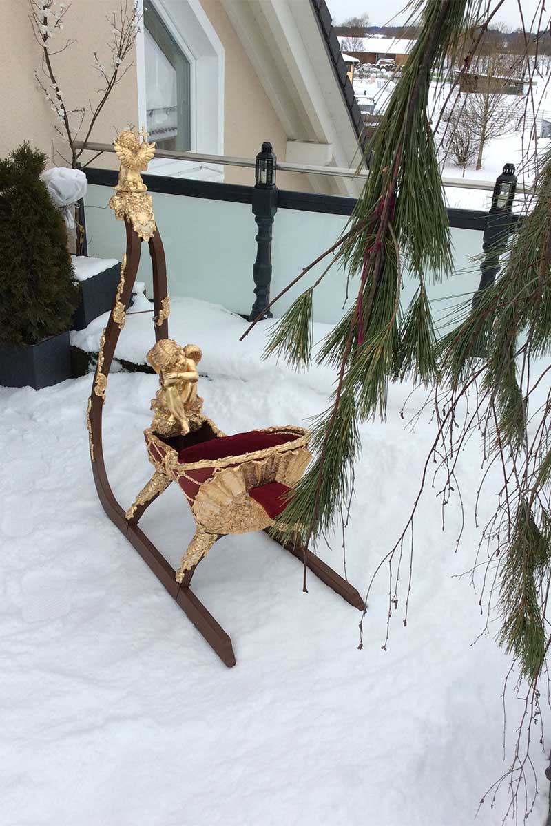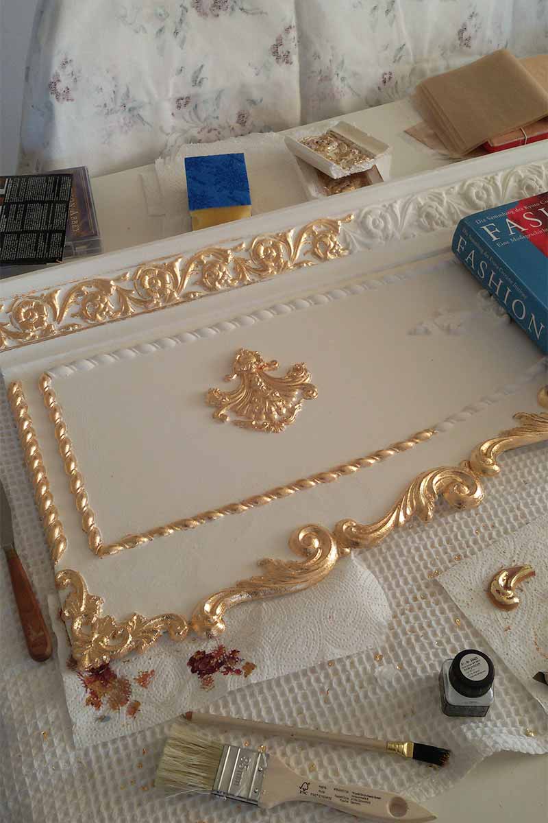 Ein weiterer Berufswunsch von mir wäre Restaurateurin gewesen, da meine große Leidenschaft neben der Mode immer auch die kunstvolle Gestaltung und die Architektur von Schlössern und Gebäuden der Historie waren. Daher habe ich früh angefangen, mit Holz, Modelliermasse, Gold und Lackierungen eigene Kreationen entstehen zu lassen, die sich mittlerweile bis hin zu wirklich großen Projekten entwickelt haben.
